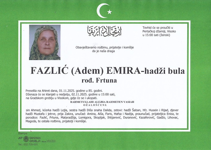 FAZLIĆ (Adem) EMIRA- hadži bula 02.11.2025. u 15:00 sati