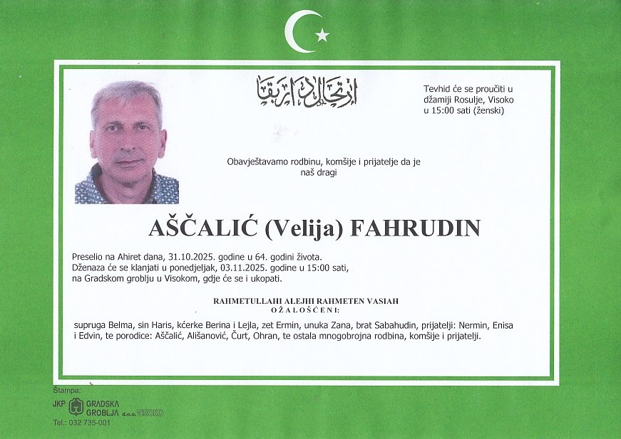 AŠČALIĆ (Velija) FAHRUDIN 03.11.2025. u 15:00 sati