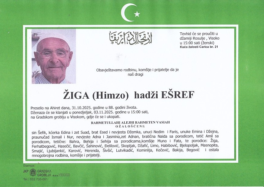 ŽIGA (Himzo) hadži EŠREF 03.11.2025. u 15:00 sati