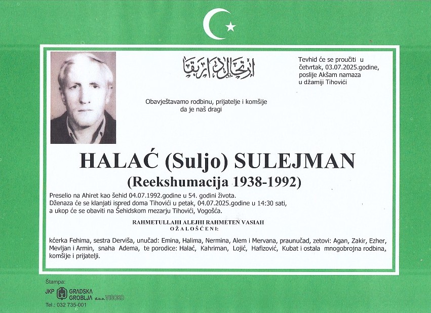 HALAĆ (Suljo) SULEJMAN 04.07.2025. godine u 14:30 sati