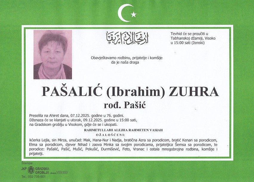 PAŠALIĆ (Ibrahim) ZUHRA 09.12.2025. u 15:00 sati