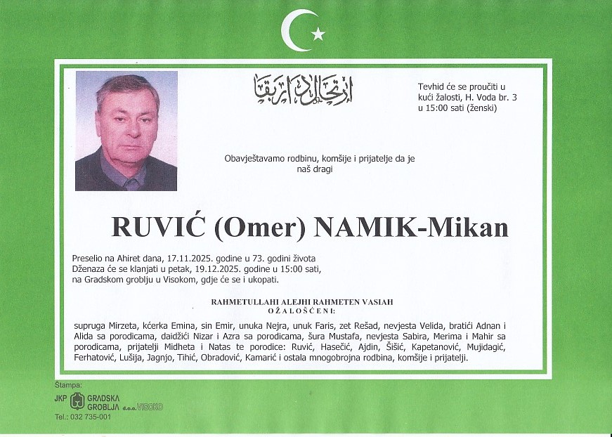 RUVIĆ (Omer) NAMIK-Mikan 19.12.2025. u 15:00 sati