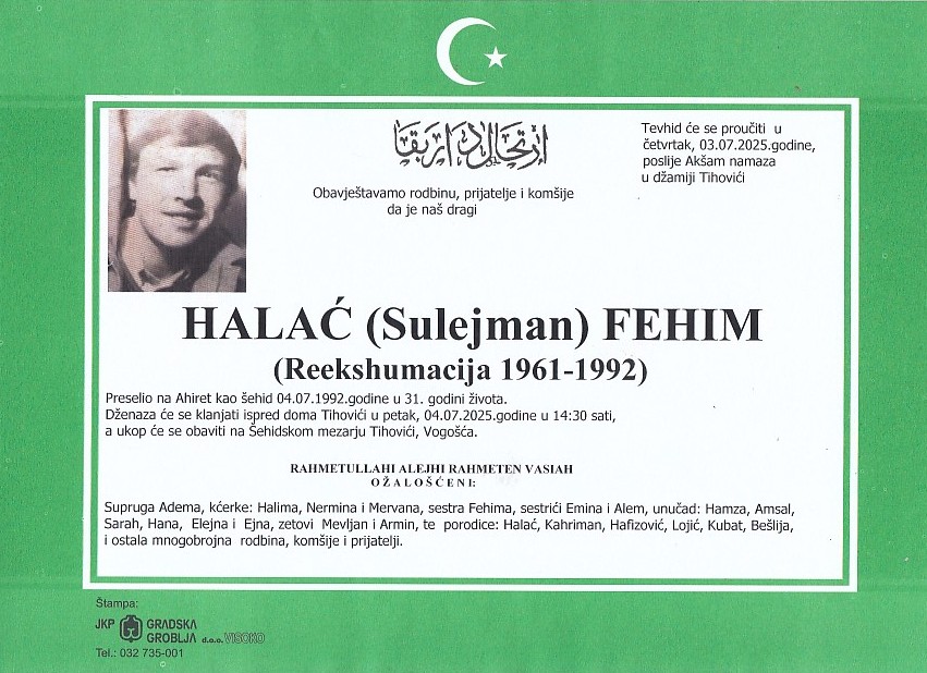 Prethodni članak: HALAĆ (Suljo) SULEJMAN 04.07.2025. godine u 14:30 sati