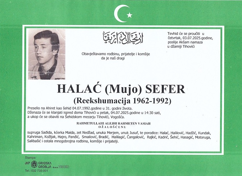 HALAĆ (Mujo) SEFER 04.07.2025. godine u 14:30 sati