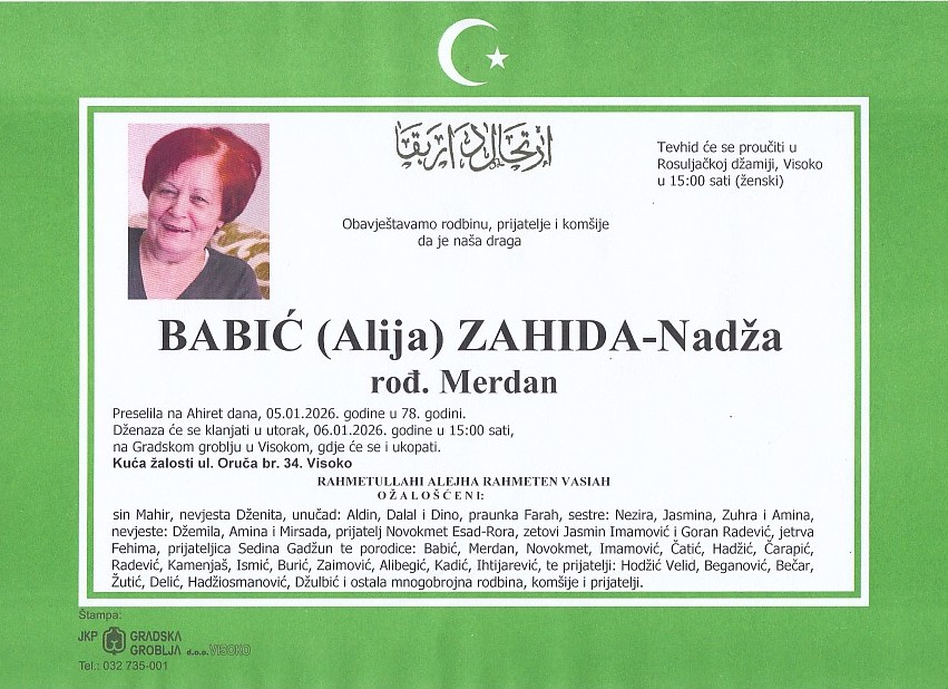 BABIĆ (Alija) ZAHIDA-Nadža 06.01.2026. u 15:00 sati