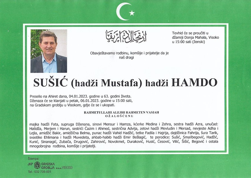 SUŠIĆ (hadži Mustafa) hadži HAMDO 06.01.2023. godine u 15:00 sati