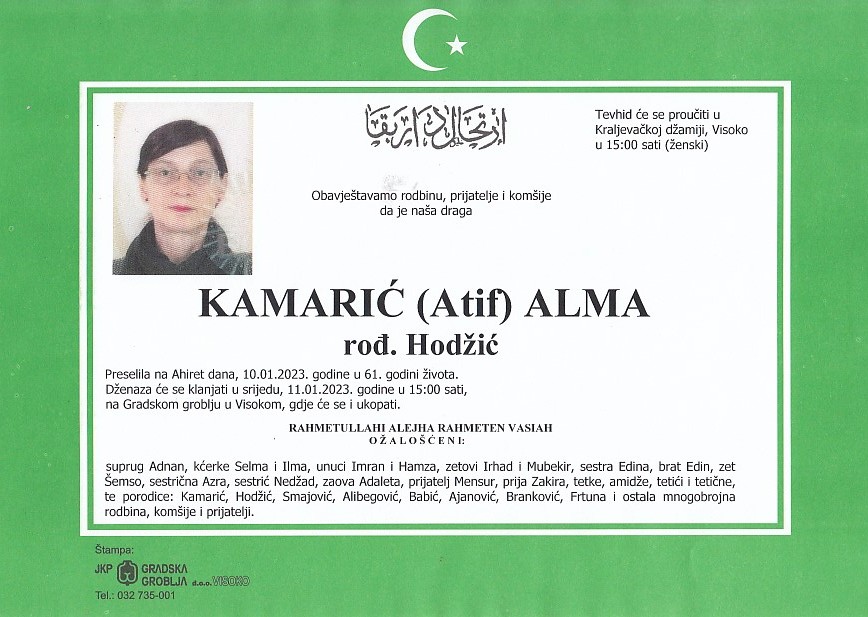 KAMARIĆ (Atif) ALMA 11.01.2023. godine u 15:00 sati