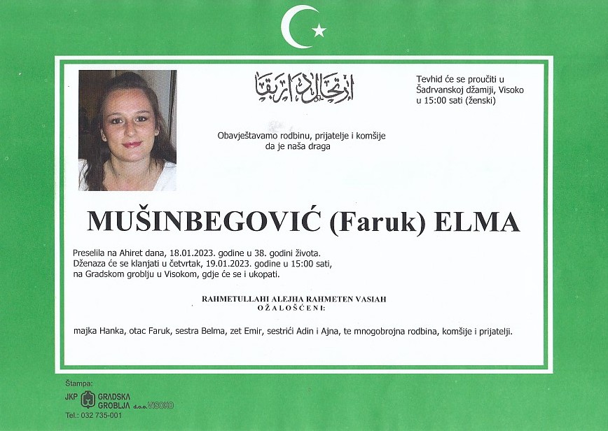 MUŠINBEGOVIĆ (Faruk) ELMA 19.01.2023. godine u 15:00 sati