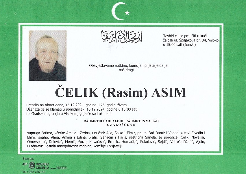 ČELIK (Rasim) ASIM 16.12.2024. godine u 15:00 sati