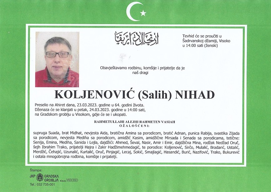 KOLJENOVIĆ (Salih) NIHAD 24.03.2023. godine u 14:00 sati