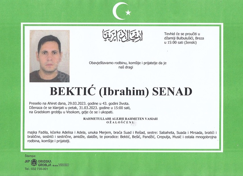 BEKTIĆ (Ibrahim) SENAD 31.03.2023. godine u 15:00 sati