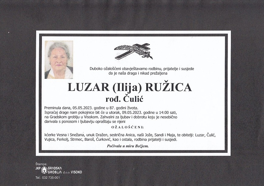 LUZAR (Ilija) RUŽICA 09.05.2023. godine u 14:00 sati