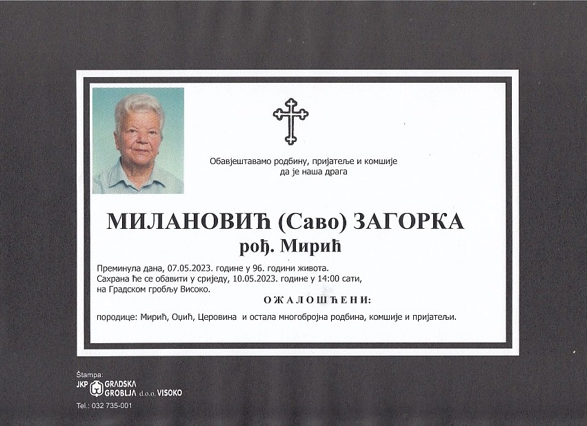 MILANOVIĆ (Savo) ZAGORKA 10.05.2023. godine u 14:00 sati