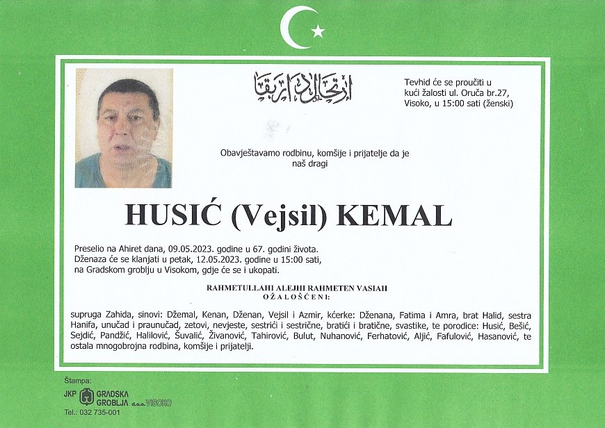 HUSIĆ (Vejsil) KEMAL 12.05.2023. godine u 15:00 sati