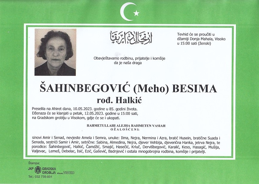 ŠAHINBEGOVIĆ (Meho) BESIMA 12.05.2023. godine u 15:00 sati