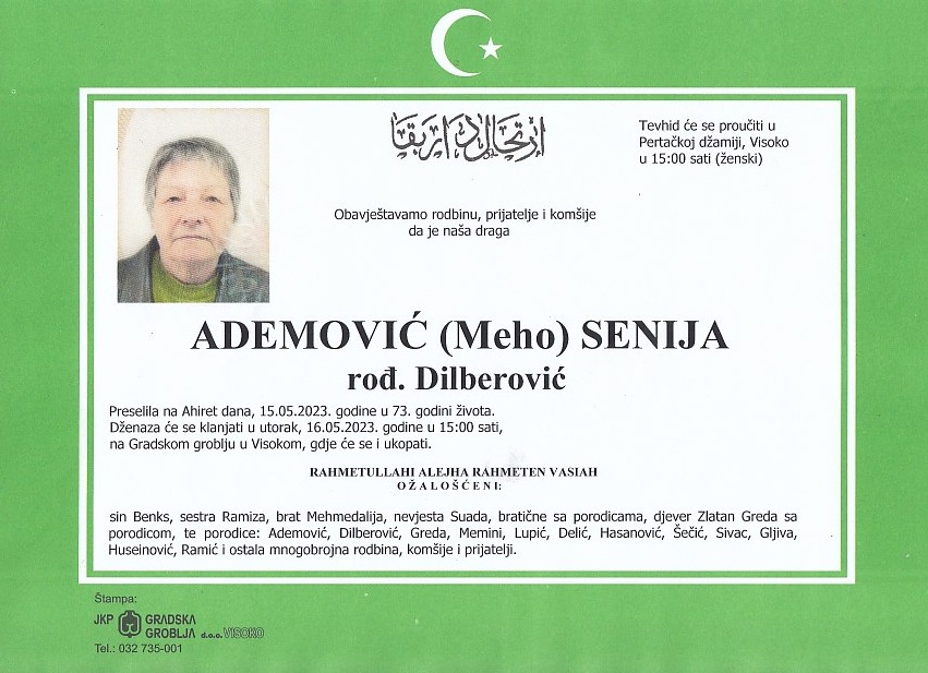 ADEMOVIĆ (Meho) SENIJA 16.05.2023. godine u 15:00 sati