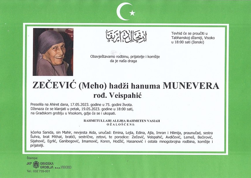 ZEČEVIĆ (Meho) MUNEVERA 19.05.2023. godine u 18:00 sati
