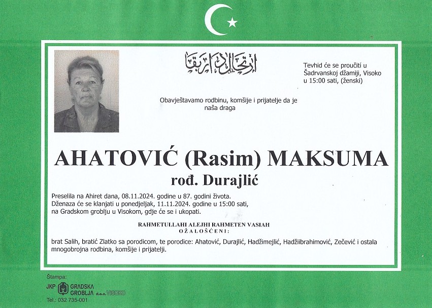AHATOVIĆ (Rasim) MAKSUMA 11.11.2024. godine u 15:00 sati