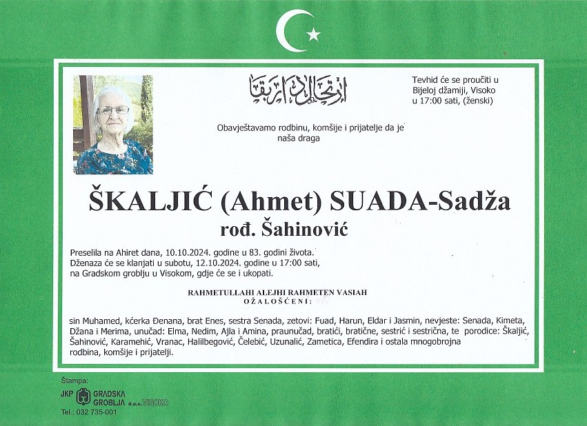 ŠKALJIĆ (Ahmet) SUADA 12.10.2024. godine u 17:00 sati