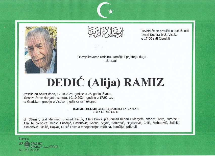DEDIĆ (Alija) RAMIZ 19.10.2024. godine u 17:00 sati
