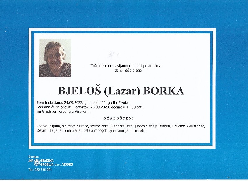 BJELOŠ (Lazar) BORKA 28.09.2023. godine u 14:30 sati